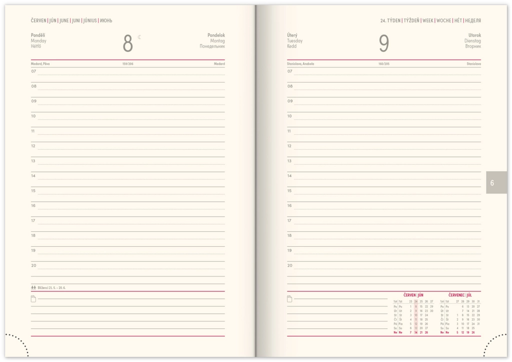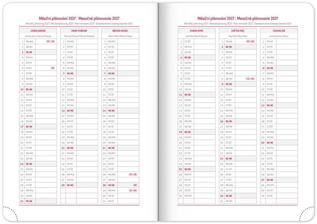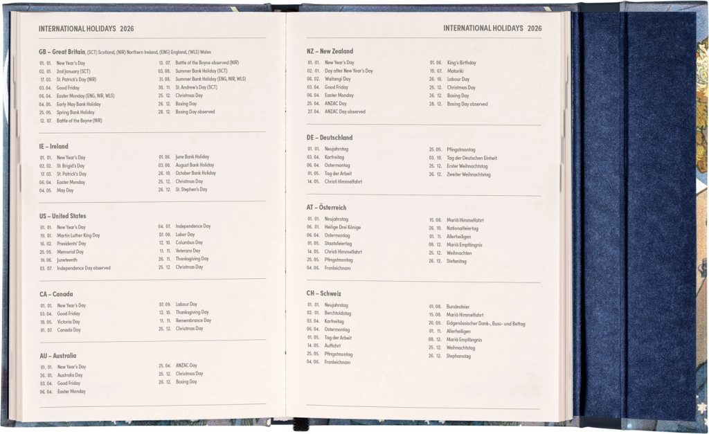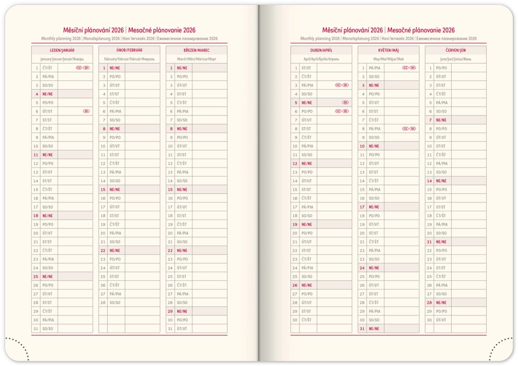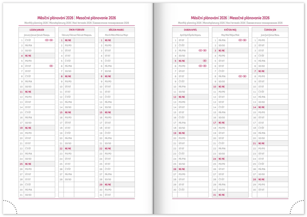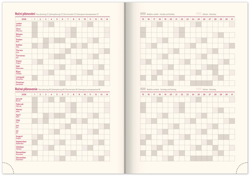 Premišljena notranja razdelitev ponuja mesečne preglede, to‑do sezname, cilje, stike in strani za zapiske. Izberite spiralno (krožno) vezavo za lahko obračanje ali trdo šivano vezavo z elastiko, držalom za pisalo, žepkom za malenkosti in perforiranimi vogali za hitro orientacijo. Kakovosten papir z višjo gramatura omejuje prepisovanje, odporne trde ali mehke platnice pa izstopajo tako v nahrbtniku kot na delovni mizi. Potrebujete šolski dnevnik za semester, delovni dnevnik za pisarno ali univerzalni planer brez datumov? Izberite razporeditev, ki vam ustreza: pregleden teden na dveh straneh za hitro planiranje, podroben dnevni razpored za veliko nalog ali kombinacijo z mesečnim koledarjem. Zaradi pametne razdelitve, motivacijskih elementov in jasne strukture boste organizirani, učinkoviti in mirni vsak dan.