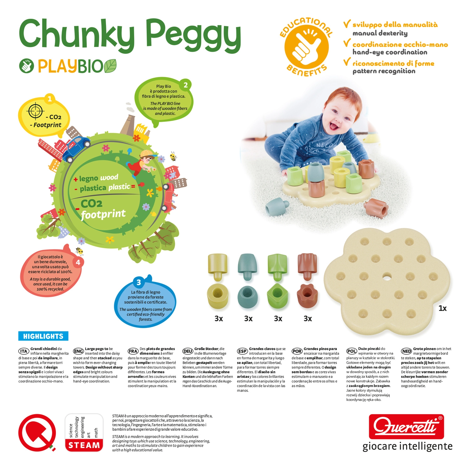 Mozaična plošča s čepki Quercetti FantaColor uri fino motoriko, prijem ter prepoznavanje barv in oblik; Georello z zobniki prikazuje principe mehanike in vzročno-posledične povezave; vijačni seti Tecno razvijajo ustvarjalnost in tehnično mišljenje. Dopolnjujejo jih magnetne črke in številke Quercetti za igrivo učenje abecede in računanja. Izberite igrače Quercetti – pisane, izobraževalne, navdihujoče in dolgoročno priljubljene pri otrocih in starših.