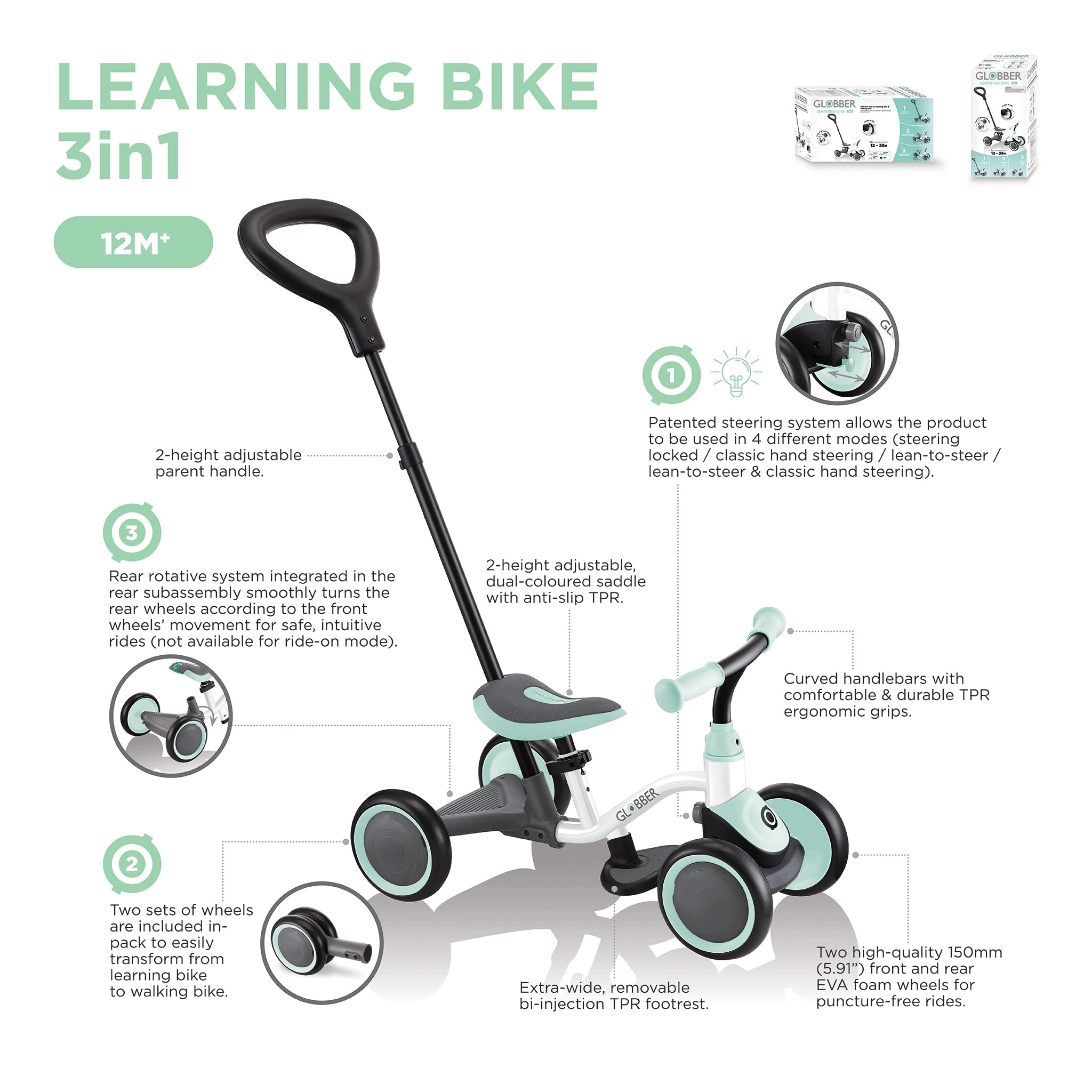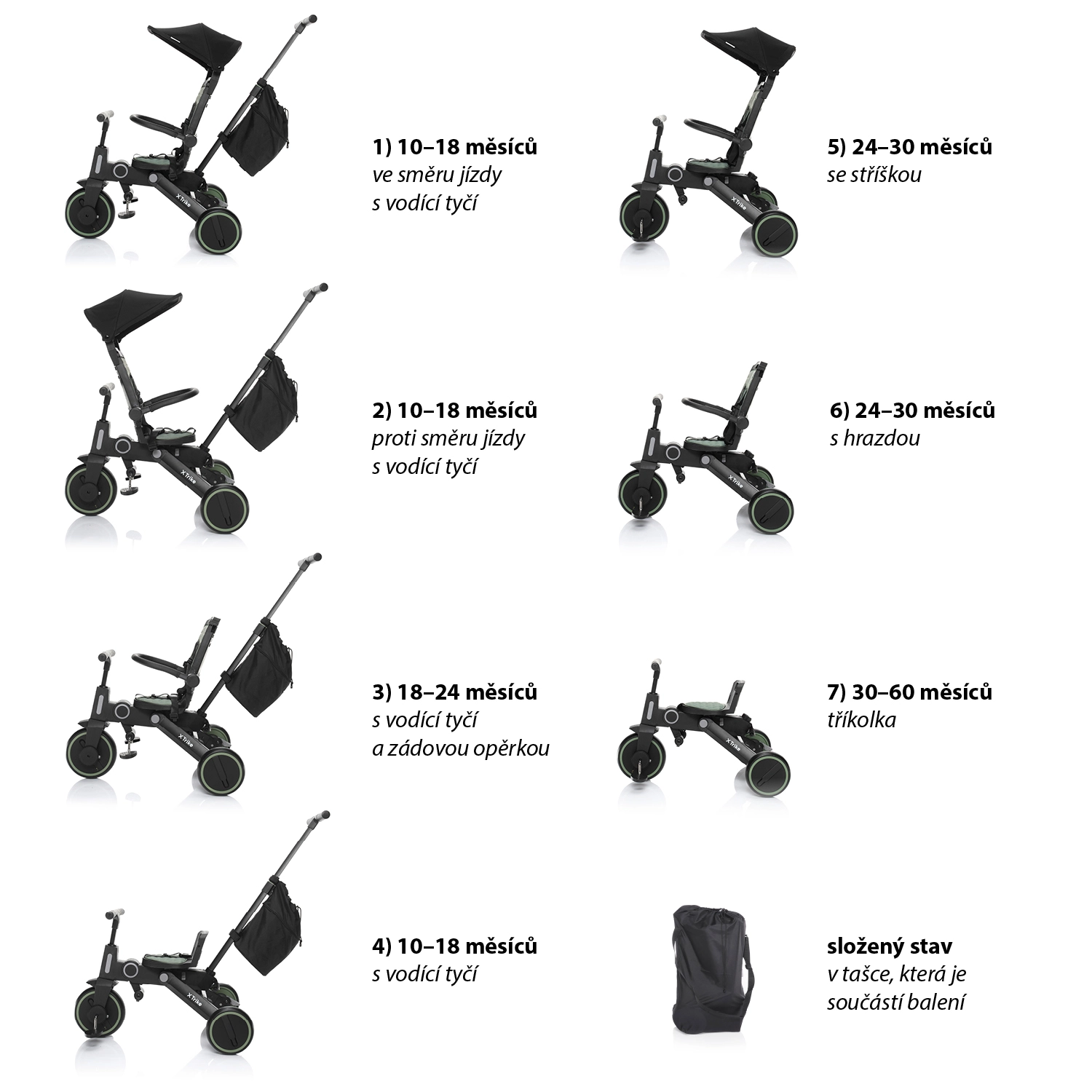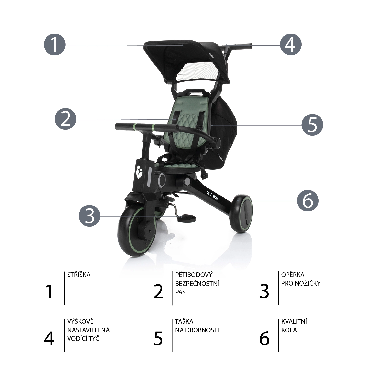 Rastoči tricikli 2v1 in 3v1 se zlahka prilagodijo starosti in višini otroka – od načina z vodilno palico do samostojnega poganjalnega tricikla. Nastavljivo krmilo, po višini nastavljiv ergonomski sedež, zložljive stopalke in nastavljiva strešica zagotavljajo udobje in zaščito na vsaki vožnji. Kolesa iz EVA pene, gumijasta ali napihljiva prinašajo tiho vožnjo in dober oprijem, protidrsni pedali in mehki ročaji pa zanesljiv oprijem; ne manjkajo košara, blatniki in zvonec. Otroški tricikel podpira ravnotežje, koordinacijo ter fino in grobo motoriko, zato vsak kilometer gradi samozavest malega voznika. Na obrabo in vremenske vplive odporni materiali, pralne prevleke, odsevniki in vidni elementi povečujejo varnost; samoumevna je tudi skladnost s standardi EN71. Ne glede na to, ali iščete zložljiv tricikel za na pot, tricikel za malčke 1–3 leta, tricikel s prostim tekom ali robusten model z višjo nosilnostjo, boste zlahka izbrali idealen tricikel za vsakodnevne zunanje dogodivščine.