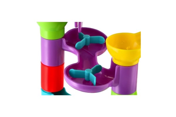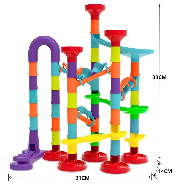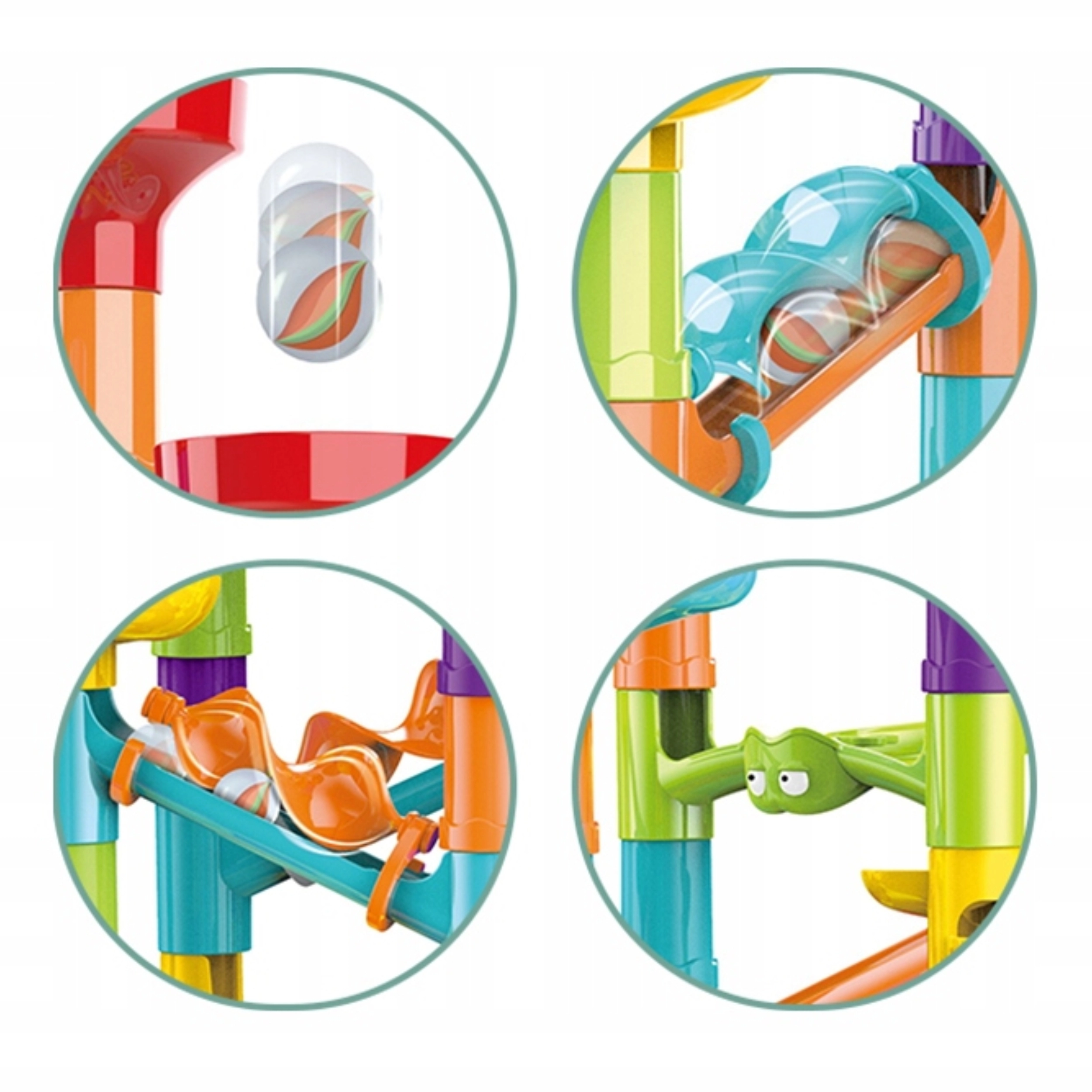 Modularni elementi omogočajo gradnjo majhnih krogov in visokih stolpov, spiral ter mostov; vsak del se natančno prilega za stabilne in varne konstrukcije. Krogelno stezo je mogoče zlahka razširiti z dodatnimi deli in razširitvami znotraj serije, kar ustvarja neskončne kombinacije tras in ovir. Kakovostni, trpežni materiali in gladke površine zagotavljajo tekoče gibanje barvitih kroglic in dolgo življenjsko dobo.