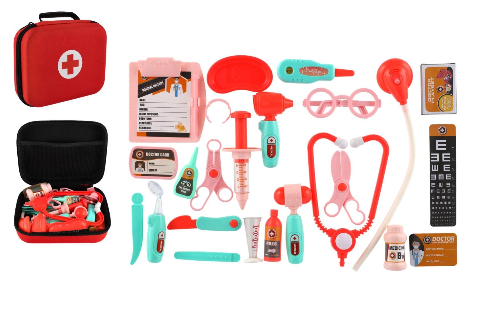 Za igro zdravnika izberite podkategorijo Zdravniki – tu najdete zdravniške komplete, zdravniški kovček, tlakomér, refleksno kladivce, povoje in kartice pacienta. Če želite raziskati zdravljenje zob in ustno higieno, se osredotočite na Zobozdravniki, kjer ne manjkajo zobozdravniško ogledalce, klešče, ščetka, komplet zob in drugi zobozdravniški instrumenti. Realistični dodatki spodbujajo komunikacijo, sodelovanje in igro vlog pri igri na zdravnika ali zobozdravnika. Otroške zdravniške igrače so na voljo kot leseni kompleti, plastični seti in tekstilni dodatki z gladkimi robovi in barvami na vodni osnovi, primerni za otroke od 3. leta dalje. Pri izbiri upoštevajte število delov, shranjevalni kovček in funkcionalne elemente (npr. vrtljive kazalce), da bo igra v ambulanti vedno zabavna, kakovostna in realistična. Zdravniške in zobozdravniške igrače spodbujajo skrb, odgovornost in učne veščine ter odlično dopolnijo vsako otroško igralnico.