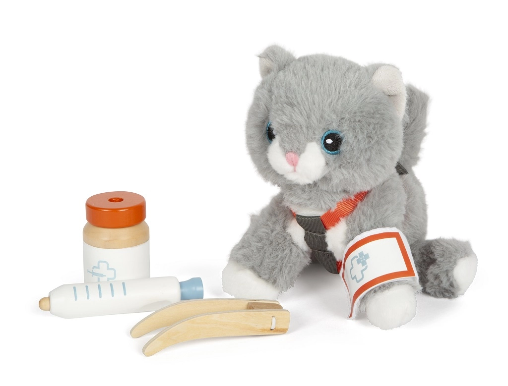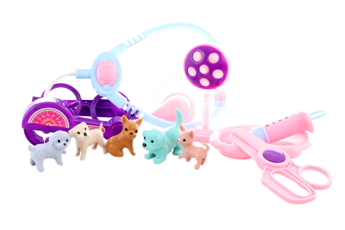 Kompleti so iz kakovostnih materialov in z varno izdelavo: gladke lesene komponente, tekstilni povoji, netoksične barve na vodni osnovi, trpežne zadrge na kovčkih in deli pogosto brez BPA. Izberite veterinarski komplet glede na starost (od 3 let), vsebino in material – od osnovnega otroškega zdravniškega kovčka za živalce do velikih setov s prenosko, rentgenskimi kartami ali opremljeno ambulanto. Otroški veterinarski komplet, veterinarski kovček in veterinarska klinika za otroke bodo v dom prinesli smiselno in kakovostno zabavo.