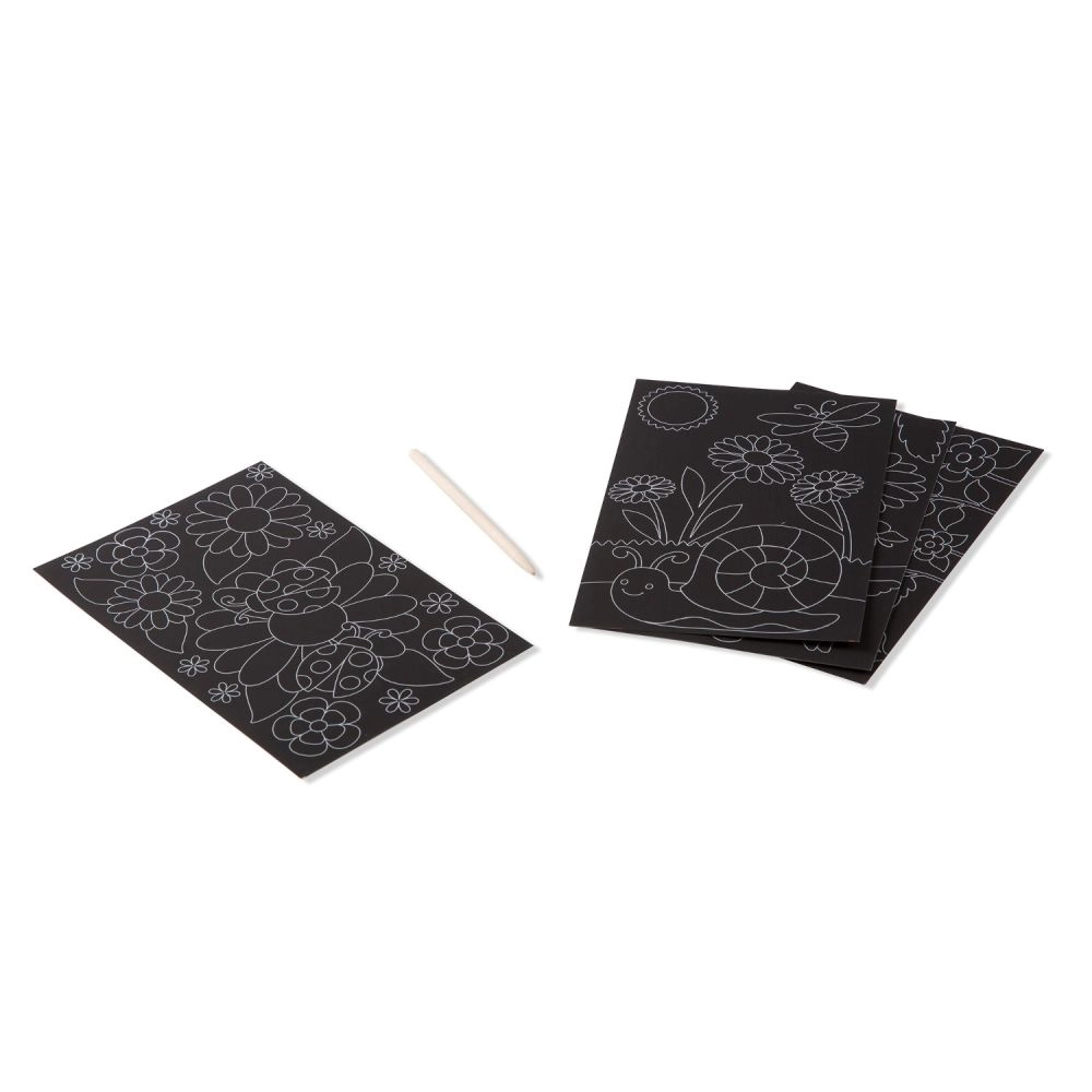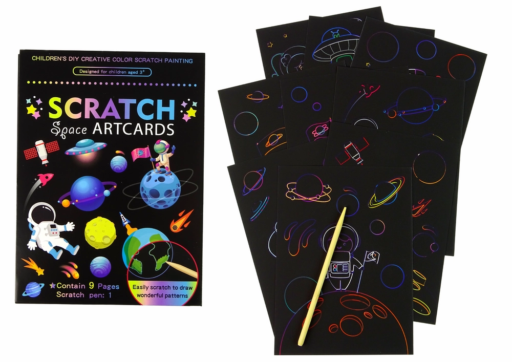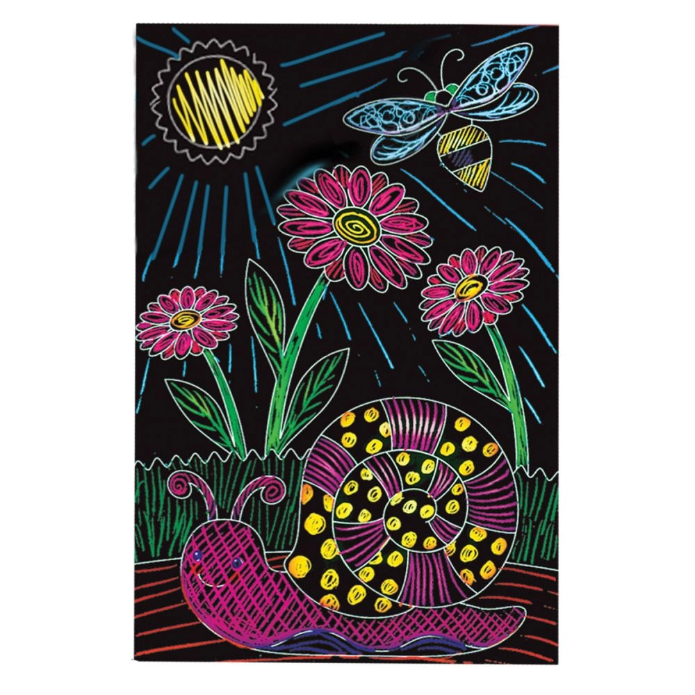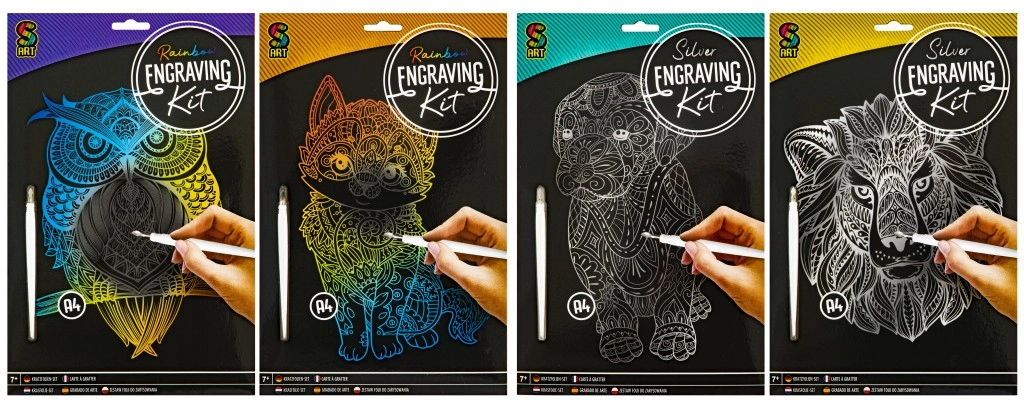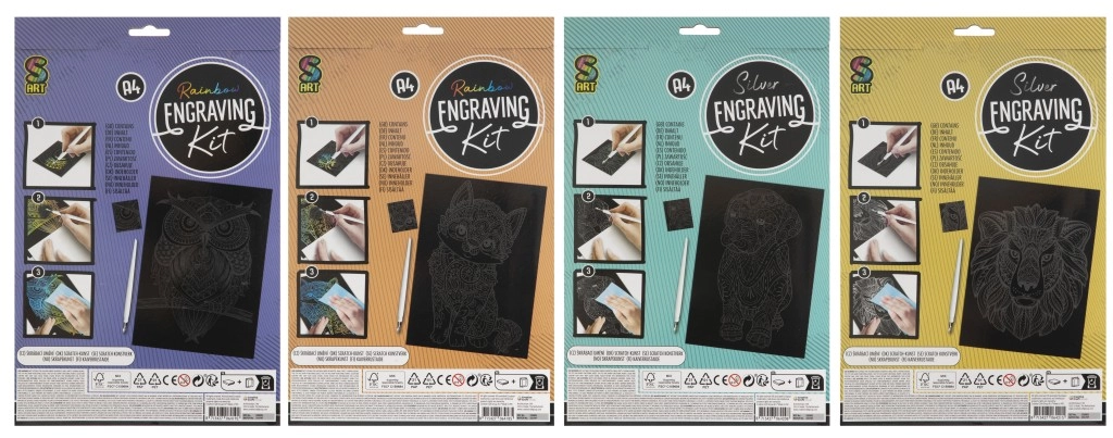 Pod črno plastjo se skriva barvni svet – le nekaj potez s praskalom in nastanejo čarobne praskanke. Scratch art (praskanke, strgalne slike) sodi med priljubljene ustvarjalne igrače in kreativne sete z mavričnimi, bleščečimi ter kovinskimi učinki in prinaša hitre rezultate. Kompleti običajno vključujejo leseno praskalo, šablone in predloge; na črnih kartonih formata A5 ali A4 zlahka ustvarite motive živali, dinozavrov, samorogov, vesolja ali mandal.