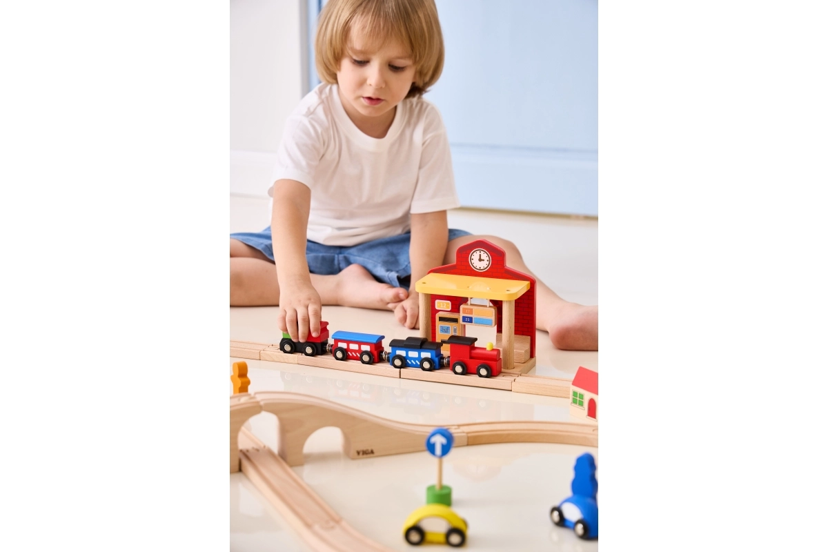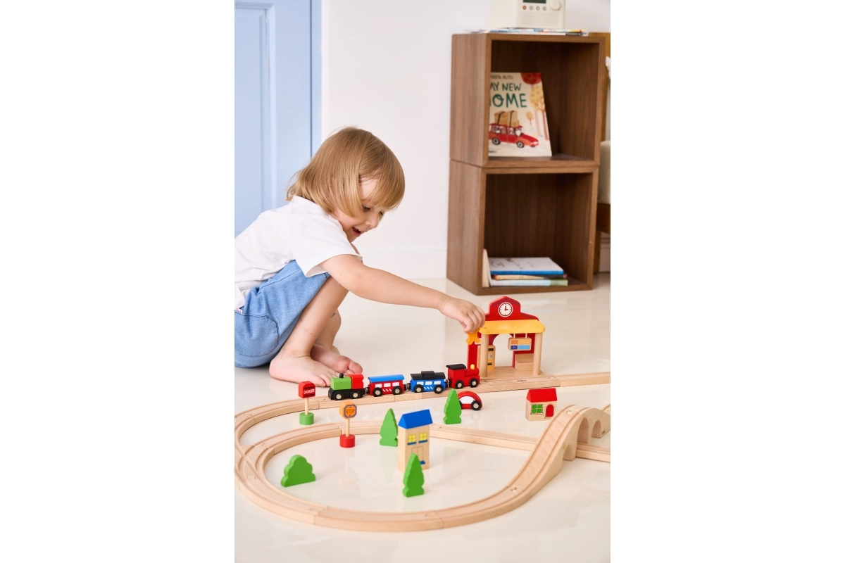 Zgradite svojim lokomotivam nov svet – dodatki za lesene vlakce spremenijo vsako tirovje v ustvarjalno igrišče polno neskončne zabave. Med dodatke za železnico spadajo leseni tiri (ravni, ukrivljeni), kretnice in križišča, rampe in prehodi, pa tudi mostovi, predori in viadukti – vse za daljše proge, večnivojske kroge in domiselne trase.
